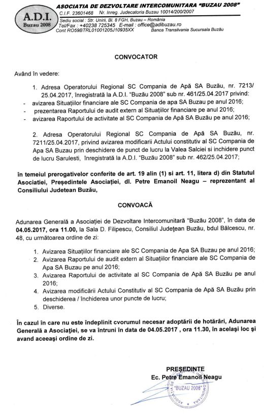 Adunarea Generală a Asociaţiei de Dezvoltare Intercomunitară „Buzău 2008” este convocată din nou în şedinţă pentru data de 4 mai având cinci puncte pe ordinea de zi. Este vorba în special despre avizări ale situaţiilor financiare, ale reportului de audit extern, ale raportului de activitate al Companiei de Apă și a unor noi modificări în actul constitutiv al Companiei de Apă. Adunarea este convocată pentru joi, 4 mai, la ora 11.00 la Sala „D.Filipescu” a Consiliului Judeţean.