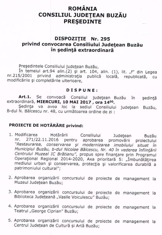 1. Modificarea Hotărârii Consiliului Județean Buzău nr. 271/22.11.2016 pentru aprobarea promovării proiectului ”Restaurarea, conservarea șimodernizarea imobilului situat în Municipiul Buzău, b-dul Nicolae Bălcescu nr. 40, în vederea înființării Centrului Muzeal I.C. Brătianu”, propus spre finanțare prin Programul Operațional Regional 2014-2020, Axa prioritară 5: ”Îmbunătățirea mediului urbanși conservarea, protecția și valorificarea durabilă a patrimoniului cultural”;